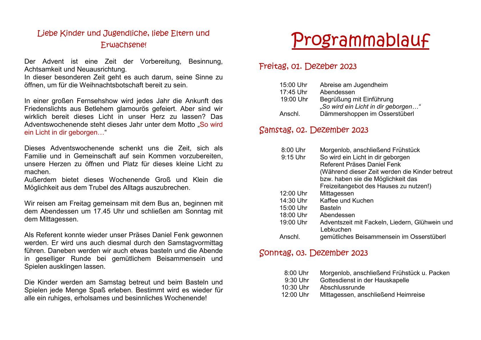 Adventswochenende für Familien vom 01. bis 03.12.2023 in Lambach